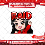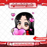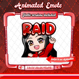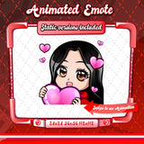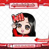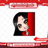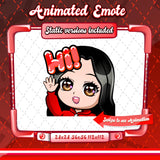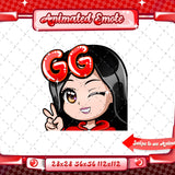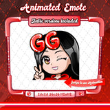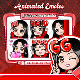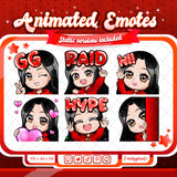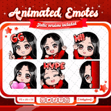 Cute animated black haired red chibi glam twitch emotes for your stream. This pack includes a gg emote, hype emote, love emote, and more! All emotes come in animated and static versions with sizes 112x112, 56x56, and 28x28.